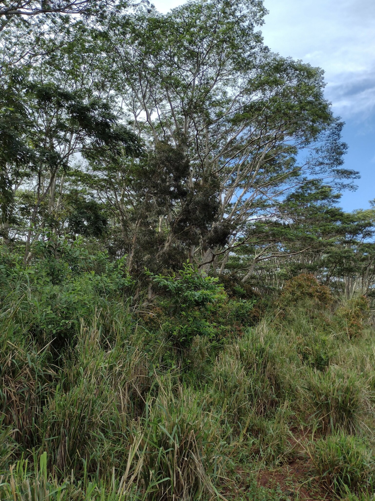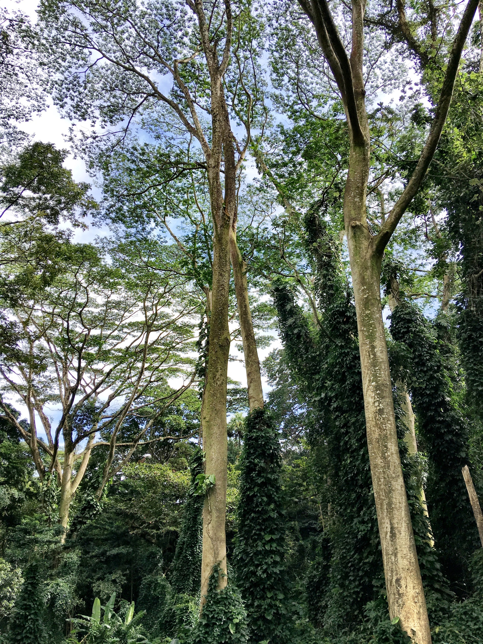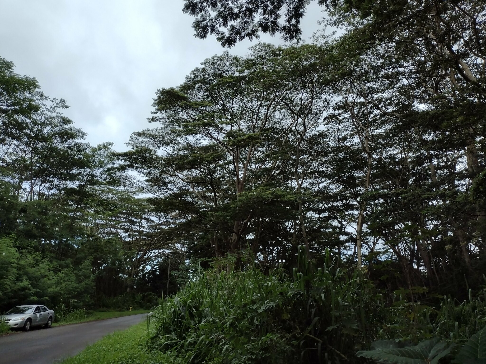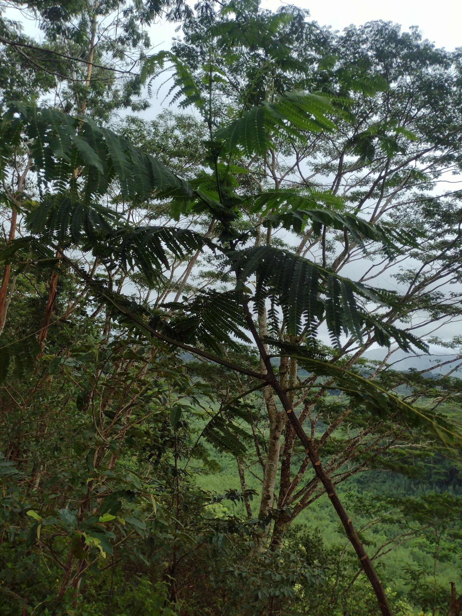 フォルカタ(Falcataria moluccana)はマルーク諸島やニューギニア原産のマメ科落葉高木で、高さ30〜40メートル、幹径1メートル以上に成長し、二回羽状複葉の葉と細長い豆果を特徴とし、窒素固定能力を持ち土壌改良やアグロフォレストリー(茶やコーヒー、ココアなどの陰樹)に活用される一方、極めて生長が速く自然林を侵食し侵略的外来種として報告されている。